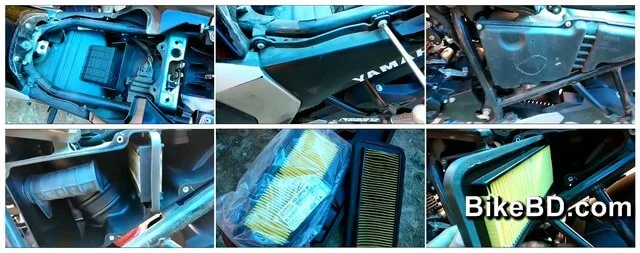 After cleaning the dust or dirt from the filter just fix it again with right direction. Yamaha recommends the cleaning of air filter in 3000km of interval and replacement after each 12000km. But considering rider’s riding habit and local environment situation the interval may shorter for better performance. And it’s really good getting the air filter neat & clean just before a long ride and after a long ride. It increases fuel economy also gives optimum engine performance.