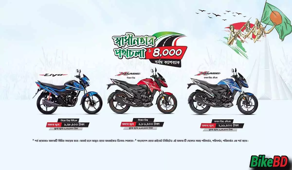 The offer is available on selected models of Honda motorcycles, including the popular Honda Livo, Honda XBlade. These motorcycles are known for their quality, performance, and reliability, making them a popular choice among customers in Bangladesh.