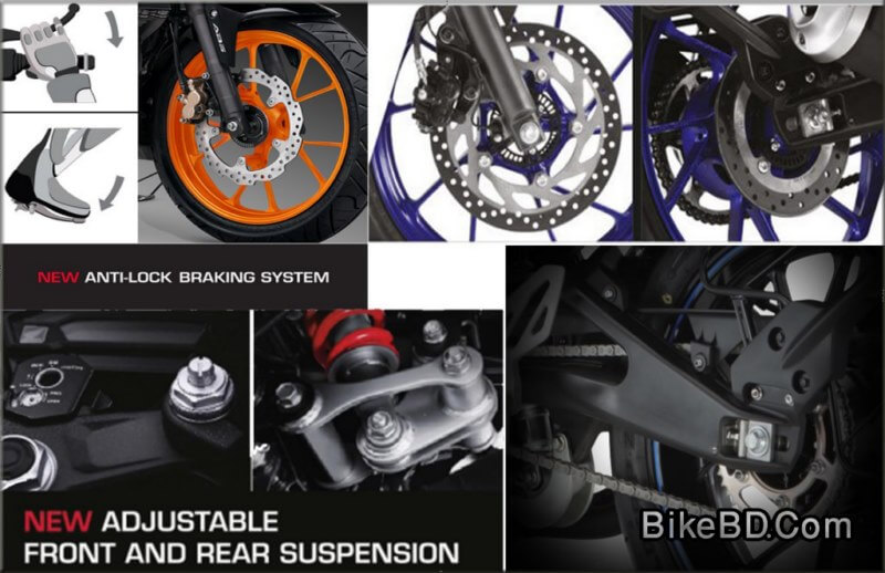 The core enhancement comes in their braking features and massive changes done in their front suspension system. Both the motorcycle holding the same previous dimension of hydraulic disc braking setup at their both wheels. But both Honda CBR150R-ABS and Yamaha R15-V3-ABS braking system upgraded with Dual-Channel ABS in their wheels.