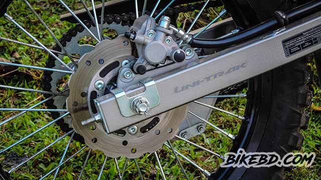 Braking and Engine Braking Performances You know KLX150BF is a 118kg light weighted machine. So its braking is effectively combined with wheel braking and engine braking system. Its wheel braking capability is quite nice. But one thing we missed from rear brake that is sudden wheel locking thereby doing the rear slide or drift.