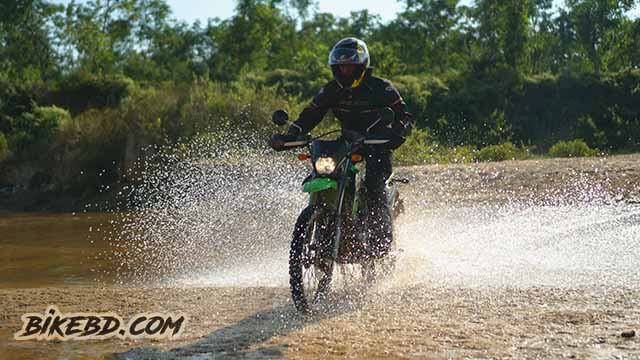 Throughout the BikeBD Kawasaki KLX 150BF Review, we found the riding, controlling, and handling characteristics of KLX150BF it’s quite different. It’s a light weighted, high saddle and high ground clearance Enduro figure motorcycle. Hence seating on the bike and twisting the throttle diverts the rider with a different feeling and attitude. So we enjoyed the delicious riding of KLX150BF. We rode that on the highway along with bumpy and gravel roads to assume its controlling and handling characteristics. Again to measure off-road riding capability we rode off-roads including crossing the creek, riding on sandy dirt surfaces, and of course on hills.