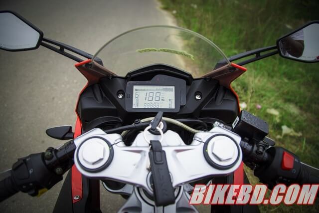 City riding experience is not the best, with sporty handle bar & USD front suspension the rider will feel lot of pain on wrist & neck for the first week to adjust the riding of this motorcycle. It is difficult for any rider to ride this motorcycle from one part of Dhaka to another carrying a pillion on a busy working day. Part of the reason is the front suspension which gives feedback on smooth rode but doesn’t work that better on bumpy or roads with potholes. Also the road conditions in Dhaka city aren’t the best followed by the huge traffic congestion. On the highway this is an open machine. The bike will give its best performance on the 4 lane highways of Dhaka – Chittagong & Dhaka – Mymensingh.