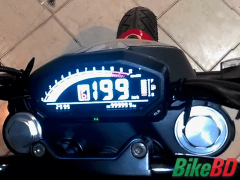The speedometer is fully digital. You can see gear indicator, fuel gauge, speed, rev counter and other warning lights. The surprising thing is that this bike has CBS(Combined Braking System). It also feature hazard indicators system.