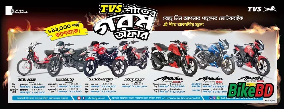 TVS Auto Bangladesh is offering the Bangladeshi biker with the TVS Winter Offer 2019. In this offer TVS Auto Bangladesh Ltd will be offering cashback on their motorcycles ranging between 3,000 to 12,000 BDT.
