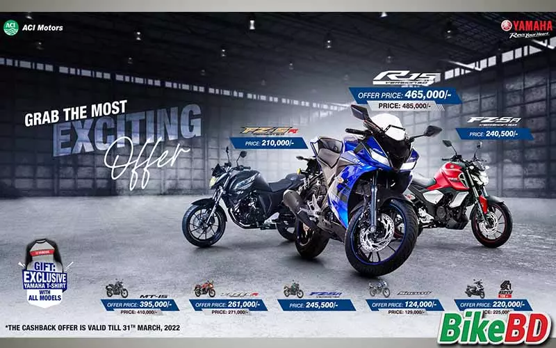 মার্চ মাসের শুরুতেই ইয়ামাহা তাদের কাস্টোমার জন্য নিয়ে এসেছে “ইয়ামাহা এক্সাইটিং ক্যাশব্যাক অফার - মার্চ ২০২২”। ইয়ামাহা তাদের কিছু সিলেক্টেড মডেলের উপর দিচ্ছে ক্যাশব্যাক অফার। প্রিমিয়ার সেগমেন্টের বাইকের জন্য ইয়ামাহা অনেক জনপ্রিয় একটি ব্র্যান্ড।