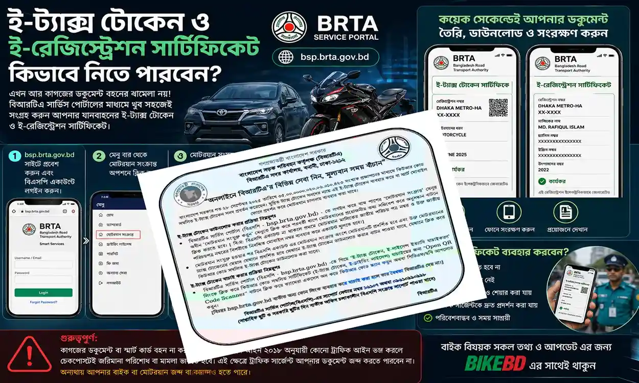 বাইক বা গাড়ি চালাতে গেলে ড্রাইভিং লাইসেন্স, ট্যাক্স টোকেন এবং রেজিস্ট্রেশন সার্টিফিকেট সাথে রাখা বাধ্যতামূলক। কিন্তু সম্প্রতি বিআরটিএ সার্ভিস পোর্টাল এর ডিজিটালাইজেশন প্রসেস দিন দিন উন্নত হওয়ার ফলে এখন আর প্রয়োজনীয় ডকুমেন্ট বহনের প্রয়োজন নেই। আজ আমরা জানবো যেভাবে খুব সহজেই আপনার স্মার্টফোন দিয়ে ই-ট্যাক্স টোকেন ও ই-রেজিস্ট্রেশন সার্টিফিকেট নিতে পারবেন।