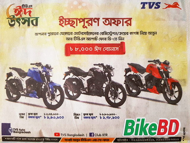 এবারের ঈদে টিভিএস মোটরসাইকেল দিচ্ছে এক আকর্ষনীয় ডিসকাউন্ট অফার। তারা তাদের ফ্ল্যাগশিপ বাইক টিভিএস এপাচি আরটিআর ১৬০ ফোরভি বাইকের সিঙ্গেল ডিস্ক এবং ডাবল ডিস্ক - উভয় ভার্শনেই দিচ্ছে ৮ হাজার টাকা ডিসকাউন্ট! টিভিএস বাংলাদেশ হটলাইনঃ 01919-194222