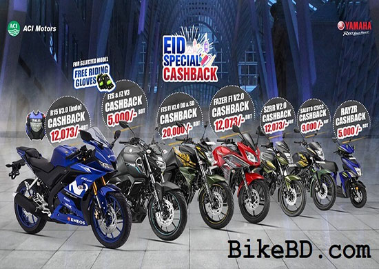 ইয়ামাহা মোটরসাইকেল সর্বদাই বাইকারদের সুবিধার্থে বিভিন্ন অফার দিয়ে থাকে, এবং এই ঈদ উপলক্ষ্যে তারা দিচ্ছে ইয়ামাহা মোটরসাইকেল ঈদ স্পেশাল ক্যাশব্যাক অফার! এই অফারের আওতায় তারা দিচ্ছে ২০ হাজার টাকা পর্যন্ত ক্যাশব্যাক! এই অফারটি ঈদের আগের চাঁদরাত পর্যন্ত বাংলাদেশের সকল ইয়ামাহা শোরুমে পাওয়া যাবে! ইয়ামাহা হটলাইনঃ +88016509