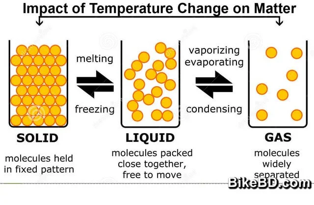 আর এই অবস্থার প্রেক্ষিতে পদার্থ কঠিন অবস্থা থেকে তরল, আর তরল অবস্থা থেকে বায়বীয় পদার্থে রুপ নেয়; আর তাদের বৈশিষ্ট্যে আমূল পরিবর্তন আসে। আর এই প্রক্রিয়ায় পদার্থের আকার আকৃতিতেও নাটকীয় পরিবর্তন ঘটে।
