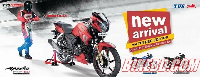 আরও একটি খুশির খবর নিয়ে এসেছে টিভিএস মোটরসাইকেল, তা হলো টিভিএস এপাচি আরটিআর ম্যাট রেড এডিশন এখন বাংলাদেশে! সম্প্রতি টিভিএস আরটিআর ম্যাট রেড এডিশন অফিশিয়ালি বাজারে ছাড়া হয়েছে।