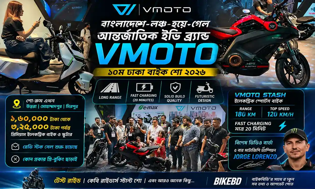 ১০ম ঢাকা বাইক শো কে ঘিরে চলছে একের পর এক চমক। বৃহস্পতিবার, ২৩ শে এপ্রিল ২০২৬ তারিখে আইসিসিবি তে অনুষ্ঠিত এই ইভেন্টে লঞ্চ হয়ে গেল আন্তর্জাতিক প্রিমিয়াম ইভি ব্র্যান্ড VMOTO.