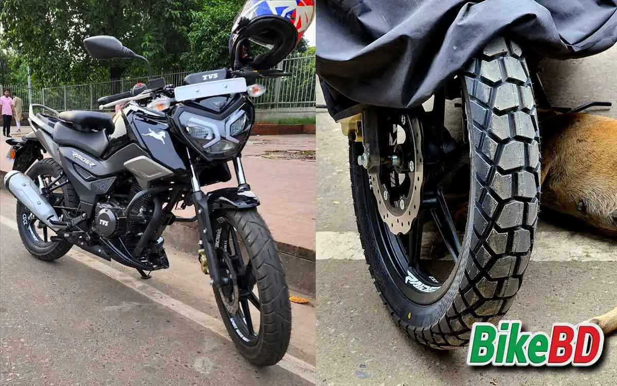 বাইকটি কেনার পর বাইকের সব দিক বিবেচনা করে বাইকের টায়ার সাইজ নিয়ে আমি সন্তুষ্ট ছিলাম না। তাই স্টক টায়ারে মাত্র ৫০ কি.মি চালিয়ে আমি আমার Raider 125 এর টায়ার পরিবর্তন করে ফেলি এবং আমার বাইকে মোটা টায়ার ইনস্টল করি। টিভিএস রাইডার বাইকটি সামনে থাকে 80/100 - 17 সেকশন টায়ার , যেটা পরিবর্তন করে আমি 90/90 - 17 সেকশন টায়ার ইনস্টল করি। বাইকটির পেছনে থাকে 100/90 - 17 সেকশন টায়ার , যেটা পরিবর্তন করে আমি 110/90 - 17 টায়ার ইনস্টল করি।