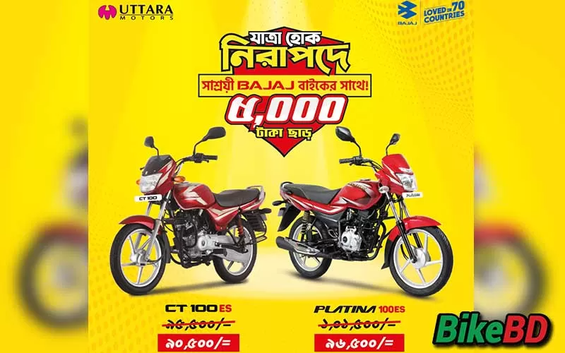 বাজাজ তাদের দুটি জনপ্রিয় কমিউটার সেগমেন্টের বাইকে দিচ্ছে ৫,০০০/- টাকা পর্যন্ত ছাড়া। বাইক দুটি হচ্ছে একটি বাজাজ সিটি ১০০ ইএস এবং অপরটি হচ্ছে বাজাজ প্লাটিনা ১১০ ইএস। বর্তমানে ৫,০০০/- টাকা ছাড়ের পর সিটি ১০০ ইএস বাইকটির দাম হচ্ছে ৯০,৫০০/- এবং প্লাটিনা ১১০ ইএস বাইকটির দাম হচ্ছে ৯৬,৫০০/- টাকা।