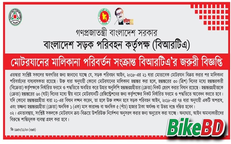 যানবাহনের মালিকানা পরিবর্তন করা নিয়ে বাংলাদেশ সড়ক পরিবহন কর্তৃপক্ষ BRTA থেকে জরুরী বিজ্ঞপ্তি দেয়া হয়েছে। যারা পুরাতন বাইক কিনেন এবং বাইক কিনে মালিকানা পরিবর্তন করেন না তাদের এই বিষয়টি জানা দরকার।