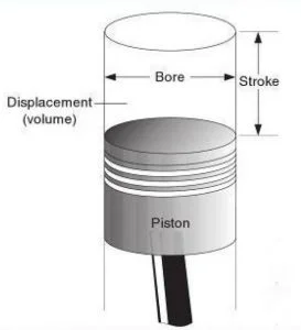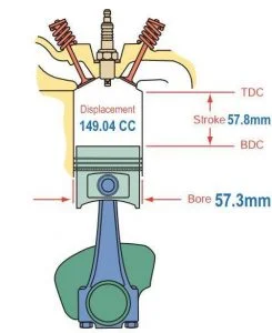 উপরের চিত্রে আপনারা মোটরসাইকেল ইঞ্জিন এর বোর ও স্ট্রোক দেখতে পাচ্ছেন। এটা ইঞ্জিনের ডিসপ্লেসমেন্ট আয়তন পরিমাপে ব্যবহৃত হয়। এই আয়তন ইঞ্জিনের আকার কতো বড়ো তা বোঝায়। এবং, মোটরসাইকেলের ওজন ও ভরের সঙ্গে সম্পর্কযুক্ত।