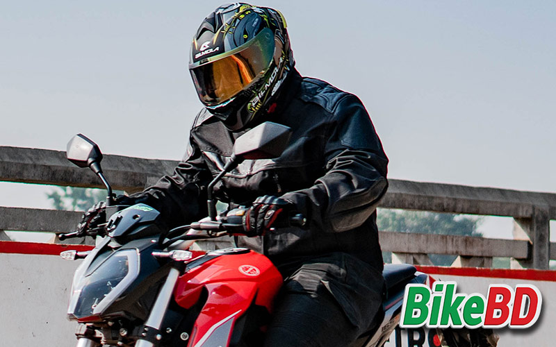 ৬) গরমে আমি কলার ছাড়া সম্পূর্ণ হাতার উজ্জ্বল রঙের টি শার্ট এবং জিন্স শ্রেয় মনে করব। কলার ছাড়া কারণ বাতাসে কলারটি আপনার পিছনের দিকে ভিতরে ঝুলে পরবে এবং ৭০+ গতিতে যাওয়ার পর কলারের কারণে আপনার কাঁধে বারবার গরম অনুভূত হবে। যেটি আপনার চালানোতে সমস্যা করবে। রাস্তার সব বালিও আপনার কলারটির মধ্যে দিয়ে প্রবাহিত হবে। সম্পূর্ণ হাতার উজ্জ্বল রঙের টি শার্ট কারণ এটি রাস্তার অন্য চালকের দৃষ্টি আকর্ষণে সাহায্য করবে ফলে দুর্ঘটনা এড়ানো সম্ভব হবে আর আপনার হাতকে রোঁদে পোড়া হতে রক্ষা করবে। এজন্য অধিকাংশ বাইক চালকেরা দেখবেন তাদের হাতের আঙ্গুল থেকে বাহু পর্যন্ত অংশটি কালো কিন্তু এর পরের অংশের রঙ কিছুটা ভিন্ন। শীতকালে বাইক চালকের একটি চামড়ার জ্যাকেট অথবা শরীরের সাথে শক্তভাবে লাগানো এমন যেকোন গরম জামা পরা উচিত।