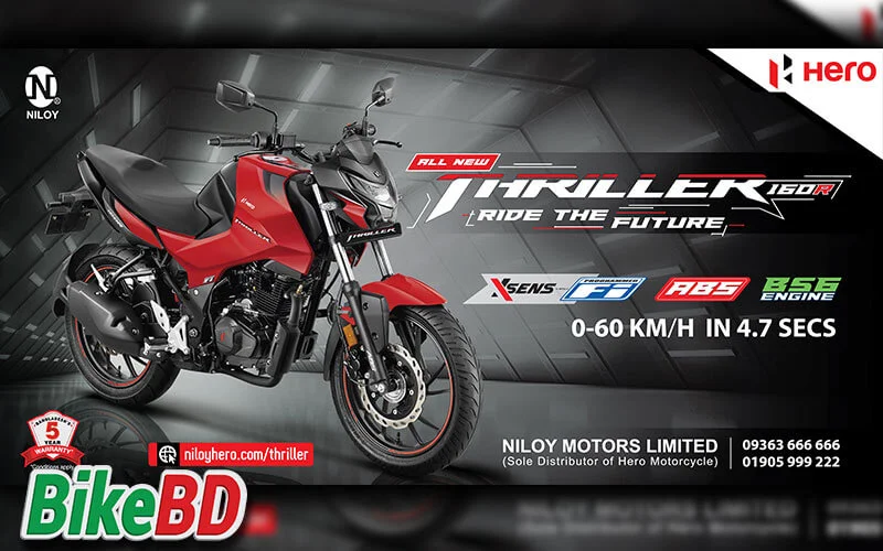 HMCL Niloy Bangladesh Ltd বাংলাদেশে হিরো মোটরসাইকেল এর একমাত্র ডিস্ট্রিবিউটর। সম্প্রতি তারা লঞ্চ করেছে তাদের নতুন মোটরসাইকেল Hero Thriller 160R। বাইকটি হিরো বাংলাদেশ এর প্রথম স্পোর্টস কমিউটার মোটরসাইকেল এবং তারা এই বাইকটিতে অনেক ফিচার্স যুক্ত করেছে।
