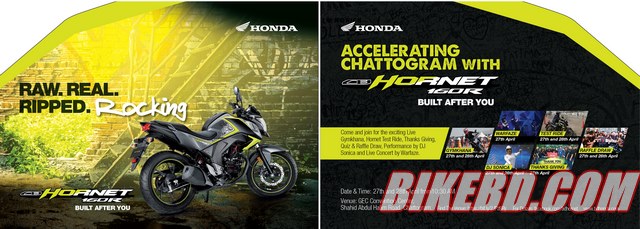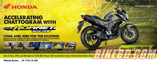 বাংলাদেশ হোন্ডা প্রাইভেট লিমিটেড চট্টগ্রামে আয়োজন করেছে হোন্ডা সিবি হরনেট ১৬০আর এর মেগা ইভেন্ট। এই মেগা ইভেন্টটি ২৭ এবং ২৮ এপ্রিল ২০১৮ তারিখে চট্টগ্রামের জিইসি কনভেনশন সেন্টারে অনুষ্ঠিত হবে। হোন্ডা সিবি হর্নেট ১৬০আর বাইকটি বাংলাদেশে ১৭ ফেব্রুয়ারী ২০১৮ তে লঞ্চ হয়েছিল। বাইকটি বাইকারদের মাঝে প্রচুর জনপ্রিয়তা অর্জন করে এবং প্রথম মাসেই বাইকটির ১৫০০ ইউনিট এর মত সেল হয়।