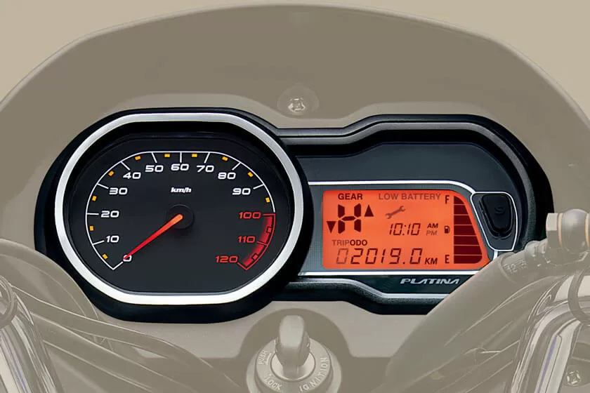 Platina 110 H বাইকে ডিজিটাল কন্সোলের সাথে গিয়ার শিফট ইন্ডিকেটর আছে। চালক মোটরসাইকেলটি বর্তমানে কোন গিয়ারে চালাচ্ছে এবং কোন গিয়ারে চালানো উচিৎ তা মিটারে দেখতে পারবে।