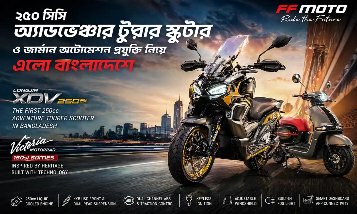 FF Moto বাংলাদেশে ২৫০ সিসির প্রথম এ্যাডভেঞ্চার ট্যুরার স্কুটার লঞ্চ করেছে। Longjia XDV 250si স্কুটারটি বেশ প্রিমিয়াম এবং স্পেশালি লং ট্যুরের জন্য বানানো হয়েছে। কি-লেস ইগনিশন সিস্টেম, KYB USD front and dual rear adjustable suspension, ফাংশনাল ডুয়াল চ্যানেল এবিএস, ট্র্যাকশন কন্ট্রোল, এডজাস্টেবল উইন্ড শিল্ড, বিল্ট ইন ফগ লাইট সহ আরো অনেক ফিচার দেওয়া হয়েছে।