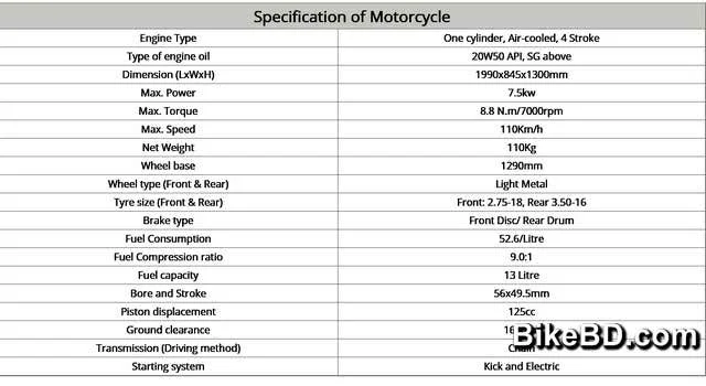 তাছাগা এর কম্প্রেশন রেশিও ৯.০ : ১ এবং এর ওজন মাত্র ১১০ কেজি। তাহলে বুঝতেই পারছেন বাইকটি বানানোই হয়েছে প্রাত্যহিক কমিউটিং ও সপ্তাহান্তে ছোটোখাটো ক্রুজ করার জন্য। ইঞ্জিনে জ্বালানি সরবরাহ হয় কার্বুরেটরে এবং কিক ও ইলেকট্রিক উভয় পদ্ধতিতেই স্টার্ট দেওয়া যায়।