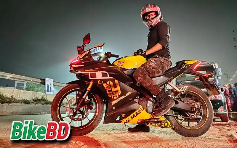 মডিফিকেশন- শখের বাইক একটু মডিফাই না করলেই নয়। ছোটবেলা থেকেই আমার সবচেয়ে পছন্দের বাইক Yamaha YZF R1M. দেশে সিসি লিমিটেশনের জন্য এই বাইক চালানোর স্বপ্ন টা স্বপ্নই থেকে গেছে। তবে চেষ্টা করেছি আমার R15 টা কে একটু R1M এর মতো লুক দেওয়ার। আমাদের দেশের এক কারিগরের কাছ থেকে R1M এর মতো হেড বানিয়ে নিয়েছিলাম গ্লাস ফাইবার দিয়ে। তারপর সেটিকে বাইকে বসিয়ে পুরো বাইকে নতুন পেইন্ট করা হলো। নতুন গ্রাফিক্স করা হলো। গ্রাফিক্সের কনসেপ্ট ছিল BumbleBee । এখন বাইকটাকে দেখতে কিছুটা হলেও R1M এর মতো দেখায়। এছারাও কিছু আফটারমার্কেট এক্সেসরিজ লাগানো হয়েছে। এই বাইকটার ভাল দিক গুলো এনজয় করছি এবং খারাপ দিক গুলোর সাথে মানিয়ে নেওয়ার চেষ্টা করছি। কারন কোন বাইকই স্বয়ং সম্পুর্ণ নয়। কিছু না কিছু খারাপ দিক প্রত্যেকটা বাইকেরই থাকে। ওভারঅল এই বাইকটাকে আমি রেটিং দিব ৮.৫/১০।