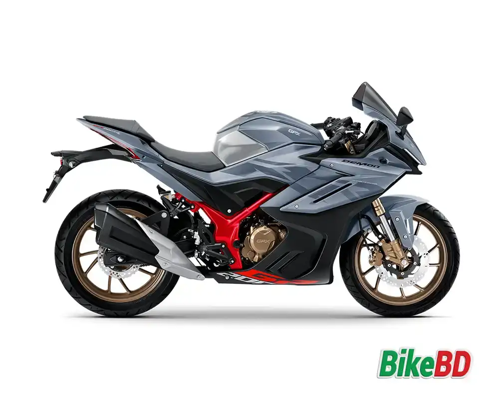GPX Demon GR250R price in Bangladesh is 414990 BDT. This Bike is powered by 250cc, which generates maximum power of 29 Bhp @ 9500 rpm, and maximum torque is 23 Nm @ 7500 rpm. GPX Demon GR250R mileage in city 30 Kmpl and on highway 35 Kmpl. It has a Dual Channel ABS Braking system with Tubeless tyres. Seat Height is 815 mm, and Weight is 158 KG. Top Speed 135 KMPH. More in this page GPX Demon GR250R comparison, check out the GPX Demon GR250R pros cons, view the GPX Demon GR250R image player, and see the GPX Demon GR250R price history to learn more before buy this bike.