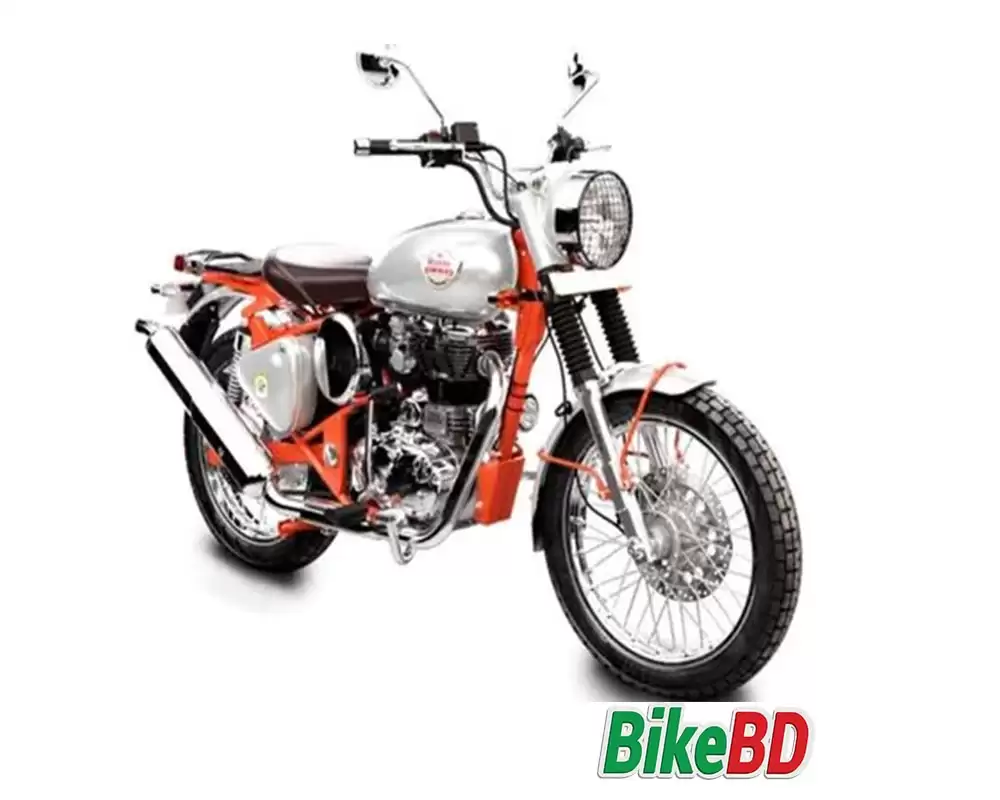 The Royal Enfield Bullet Trials 350 is a classic scrambler motorcycle produced by Royal Enfield India. The motorcycle is constructed on a highly stable single downtube steel cradle frame. On the wheels, the motorcycle features classic wired spoke steel rims and tube-type commuting tires in measure of 90/90-19 tire in the front and 110/80-18 tire at the rear. In the braking system, the motorcycle is equipped with hydraulic disc brakes on both wheels, along with a dual-channel ABS enhancement for added safety.