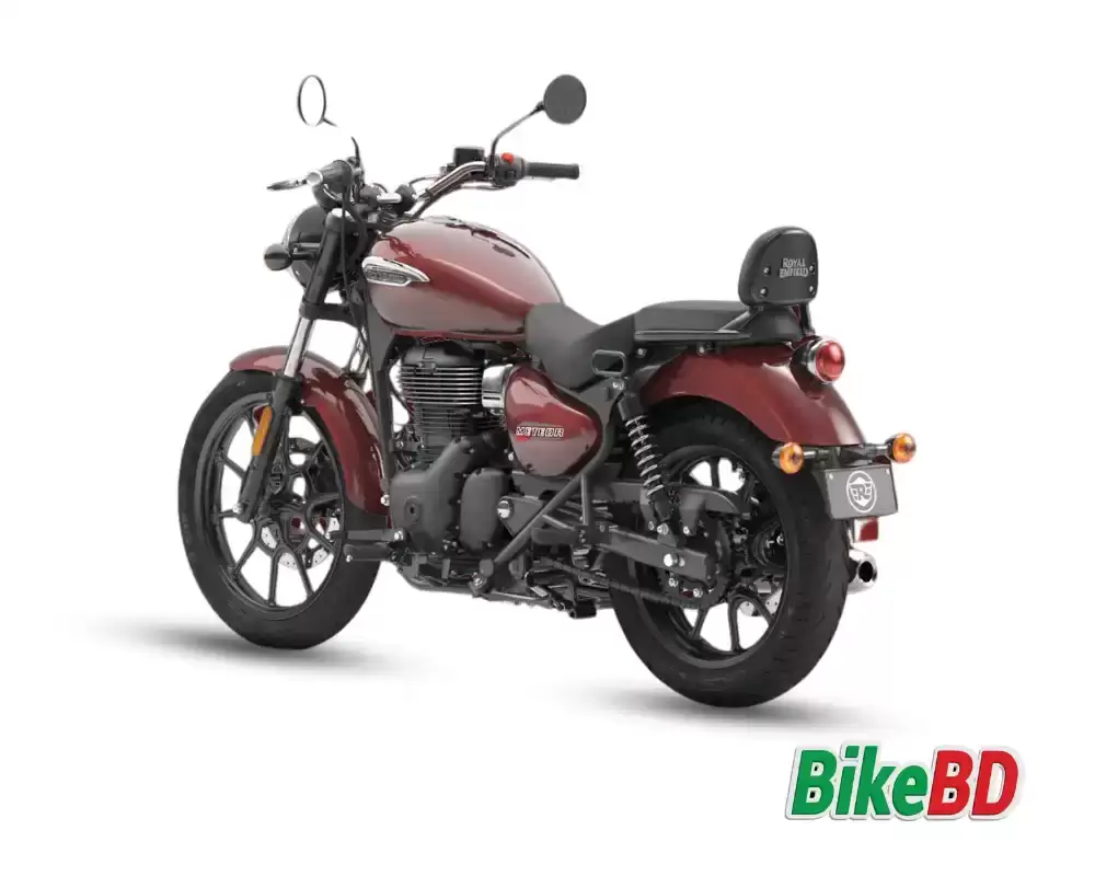 Next, the Meteor 350 Stellar features modern-styled wheels beholding all alloy rims and fatter profile tires. Matching with that, it nicely holds attractively crafted front and rear shock absorbers. Moreover, an optional larger windshield and cushioned passenger seat backrest add exceptional gravity to its design.